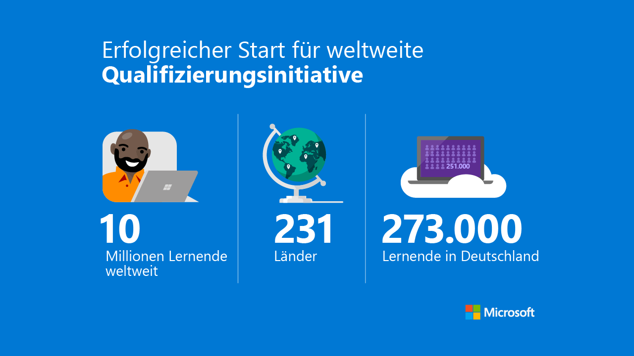 Die globale Microsoft-Initiative für digitale Qualifizierung ist erfolgreich gestartet: Seit Ende Juni haben bereits zehn Millionen Menschen aus 231 Ländern neue digitale Kompetenzen erworben. Allein in Deutschland haben sich bisher mehr als eine viertel Million Menschen mit dem Programm weitergebildet.