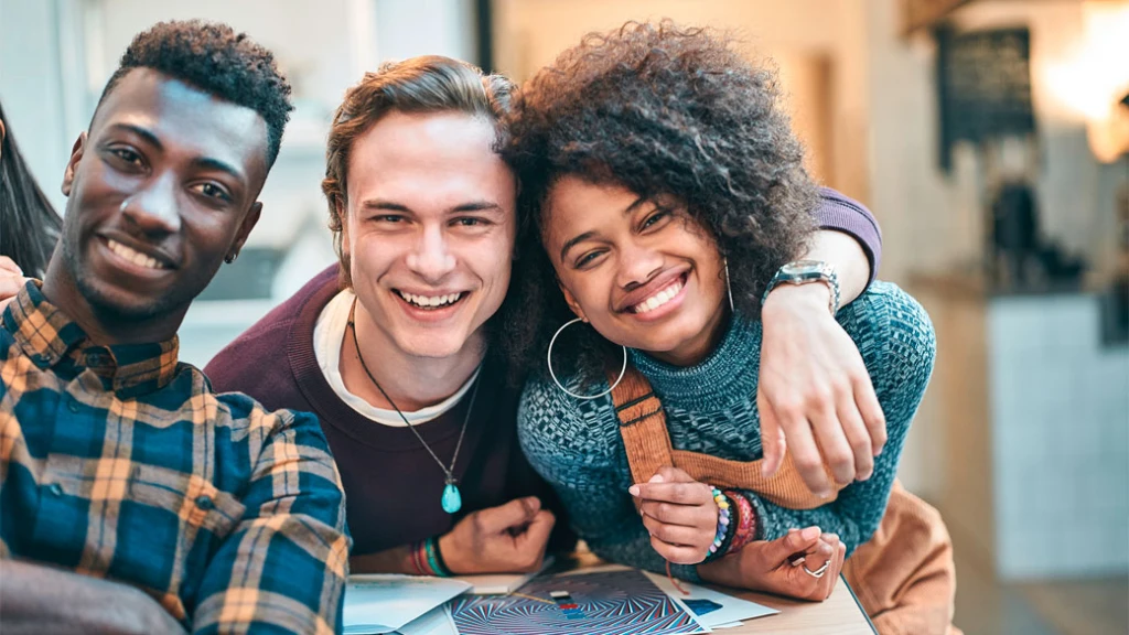 Drei Studenten lächeln in die Kamera.