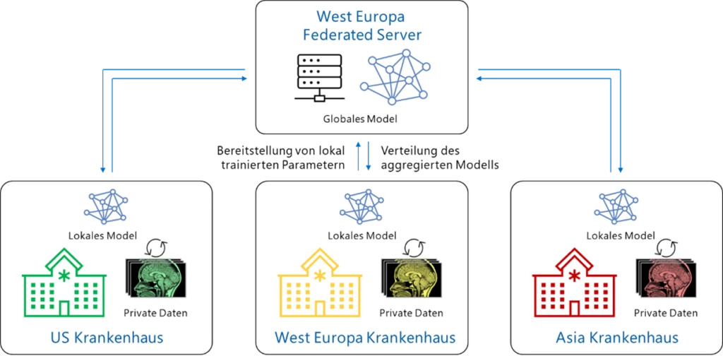 Daher bietet sich eine kollaborative Machine-Learning-Entwicklung an, bei der verschiedene Krankenhäuser ihre eigenen Daten beisteuern, im Idealfall sogar weltweit. Doch es gibt eine wesentliche Einschränkung: den Datenschutz. Wie lässt sich sicherstellen, dass sensible Patienteninformationen mit der richtigen Sorgfalt behandelt und im Einklang mit den strengen Datenschutzgesetzen der jeweiligen Länder verarbeitet werden?