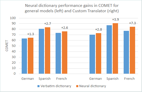 Die folgende Grafik zeigt die durchschnittliche Verbesserung der KOMET im Bildungsbereich für Englisch-Deutsch, Englisch-Spanisch und Englisch-Französisch; für allgemeine Modelle auf der linken Seite und für kundenspezifische Modelle auf der rechten Seite. BLAUE Farbbalken stellen die allgemeine Übersetzungsqualität ohne neuronales Wörterbuch dar und orangefarbene Farbbalken stellen die Übersetzungsqualität mit neuronalem Wörterbuch dar. Dabei handelt es sich um durchschnittliche Verbesserungen der gesamten Testsätze. Bei Segmenten mit einem oder mehreren Wörterbucheinträgen eines Kunden (zwischen 19 % und 63 %) beträgt die Verbesserung sogar +6,3 bis +12,9 COMET-Punkte.