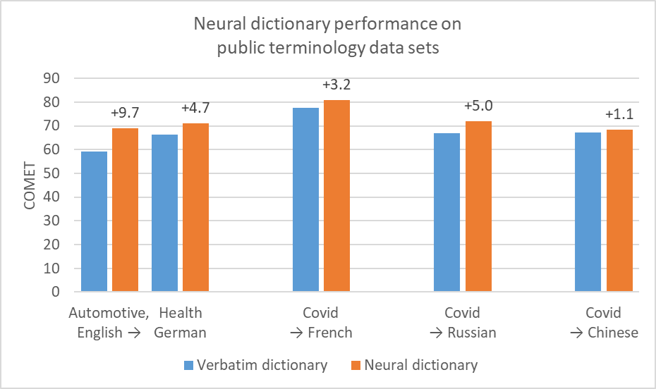 Die folgende Grafik veranschaulicht die erheblichen Verbesserungen, die die neue Funktion gegenüber gängigen, öffentlich verfügbaren Terminologietestsätzen in der Automobilindustrie (https://aclanthology.org/2021.eacl-main.271), Gesundheit (https://aclanthology.org/2021.emnlp-main.477) und Covid-19-Bereiche (https://aclanthology.org/2021.wmt-1.69) unter Verwendung unserer allgemeinen Übersetzungsmodelle.