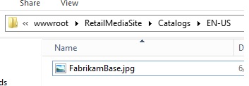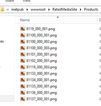 Back on our Retail Server Media Website we need to create a folder called Products under our Root Site. If you set your Media Base URL earlier to include a Sub-Folder in it, then create your Products Folder in here.  Within that Products folder we add our images based on the format we set in AX.  As you can see below: