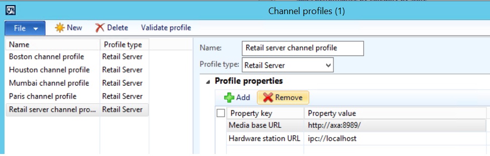 In this window we want to select the Retail Server Channel Profile that is associated to our Store.  Now in the Profiles Properties Fast tab we need to add a new key called “Media base URL”.    Once you’ve added this you need to set the Property Value to match the URL for the IIS Website we created earlier.   Keep in mind the value you specify here will be the BASE STRING for resolving the image locations and the code will be appending paths to this later in AX code.   To give you an idea of how this impacts your URL.  In the stock demo data the Media base URL property is set to “http://dax2012r2a:8989/images/”    however in another section of AX we set the product image to  be:  “images/productID#.jpg”.      What happens then is that MPOS tries to resolve the URL of “http://dax2012ra:8989/images/images/productID#.jpg”      Notice the double Images folder in this path, to load this image MPOS would have to place an image file inside of the image folder, inside of another image folder in our MediaWebSite Folder.