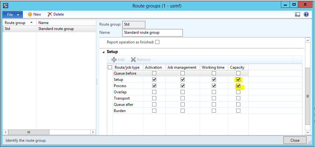 7. If you have a Route group linked to your Route operations, you should ensure that the Capacity option is turned on for both the Setup and Process Job types.