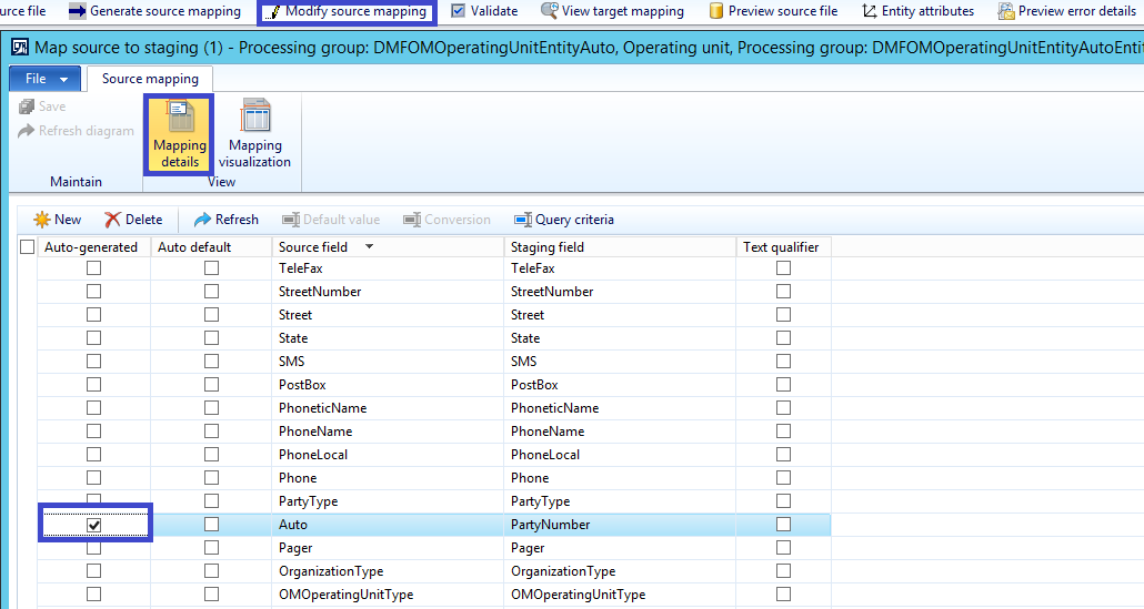 Find the PartyNumber line and check the Auto-generated checkbox and you should see that the source field changes from PartyNumber to Auto: