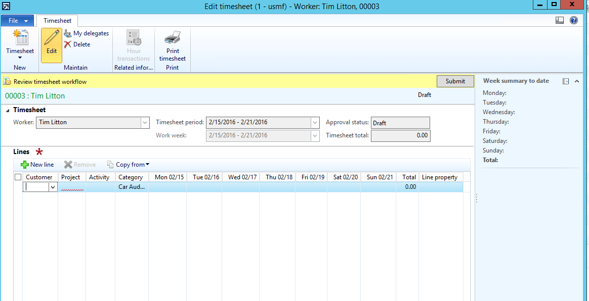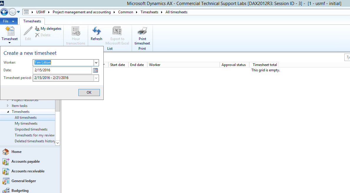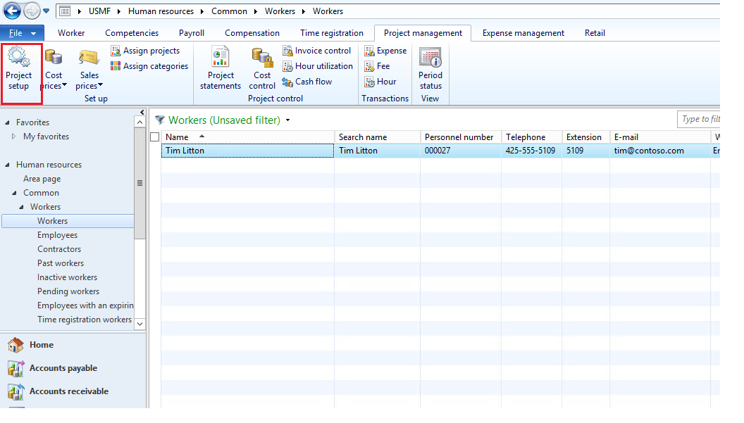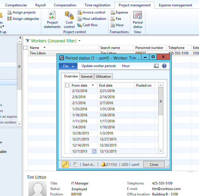 In this case I will assign Tim Litton to the period type ‘EmplWeekly’. In Human Resources\Workers\ I go to the Worker and then the ‘Project management’ tab and select ‘Project setup’