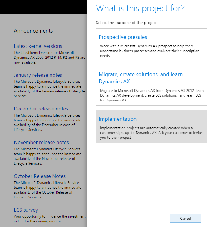- Migrate, create solutions, and learn Dynamics AX: You can use this option to create a Dynamics AX 2012 project workspace, a project for upgrading from Dynamics AX 2012 to the new AX, to learn the new Dynamics AX, or to create LCS solutions.