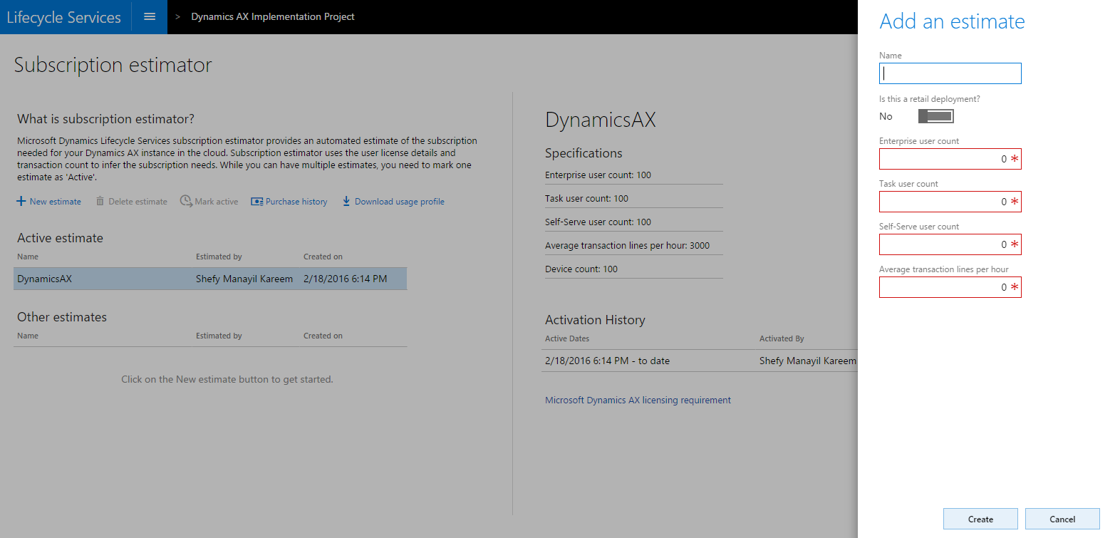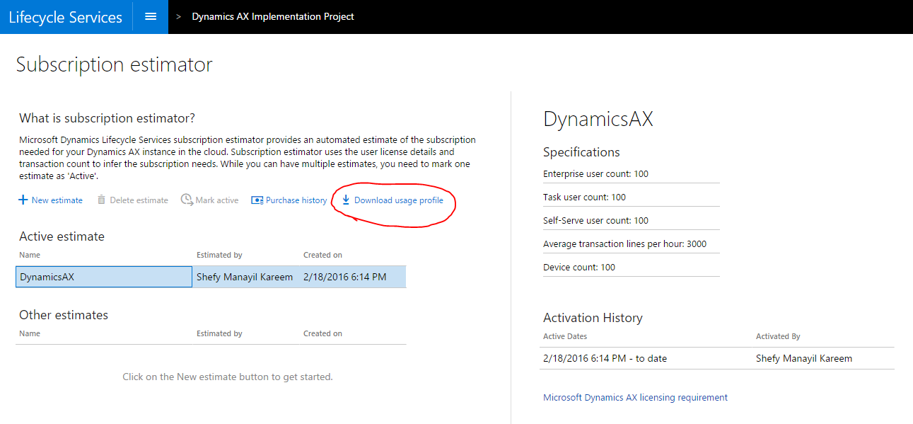 Use can use the subscription estimator to evaluate your subscription needs for the new Dynamics AX. To use the Subscription estimator, download the Usage profile Excel workbook and complete the following sheets: