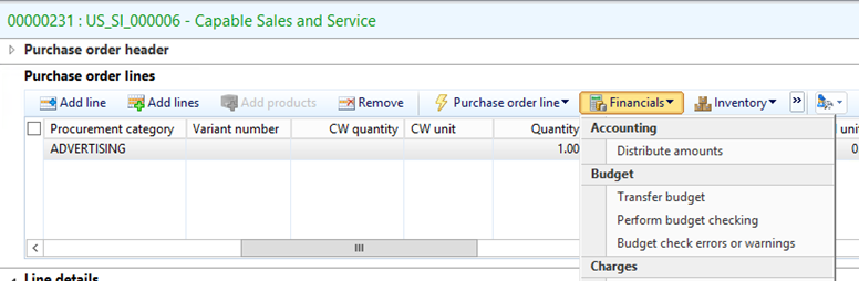 - Back under Purchase Order Lines fast tab, click Financials -> Distribute Amounts.