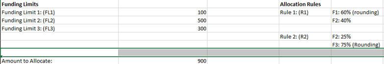 The situation has three funding limits that equal up to 900 to allocate, but with two rules that determine how the allocation will occur. Here