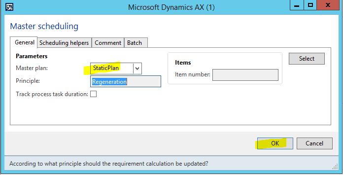 b. In the Master scheduling form, select ‘StaticPlan’ from the Master plan field, and then click OK.