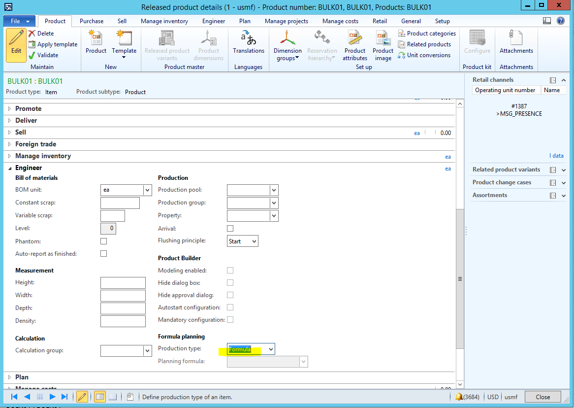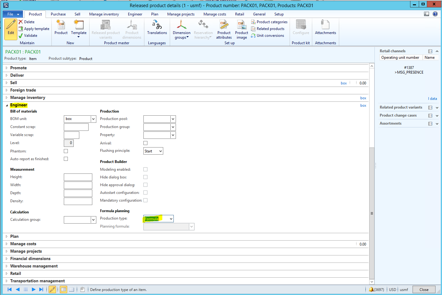 f. In the Released product details form, expand the Engineer fast tab, and select ‘Formula’ in the Production type field.