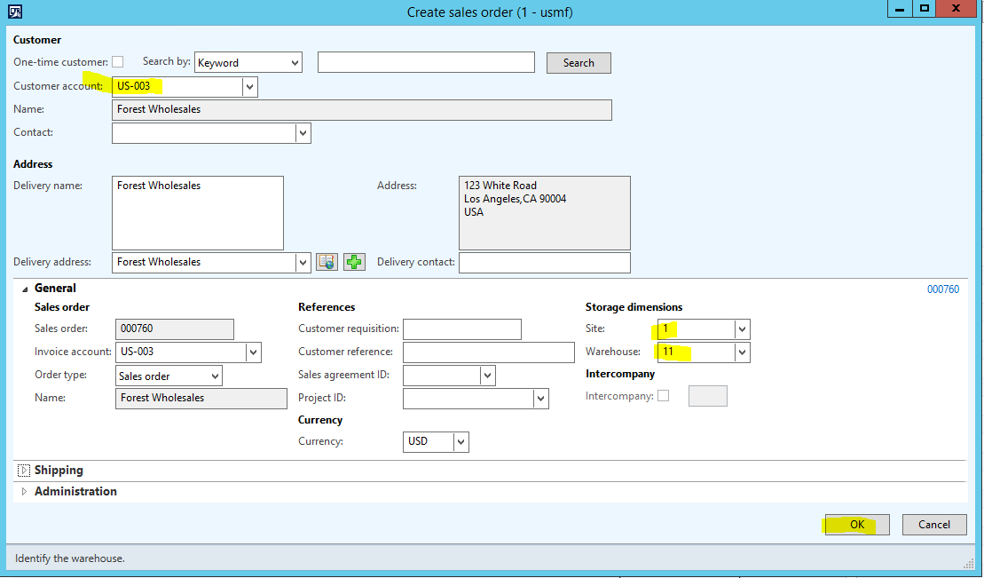 d. In the Create sales order form, expand the General fast tab, and select ‘1’ in the Site field, and ‘11’ in the Warehouse field.