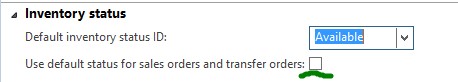 Note: You should ensure that inventory status is not defaulted on your sales lines. This is controlled in the Warehouse management parameters: the Use default status for sales orders and transfer orders check box should be cleared: