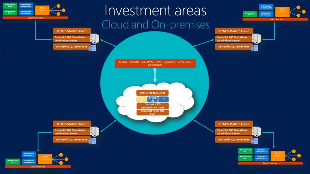 To address these scenarios, we are pursuing a pragmatic approach that combines the best of both cloud and on-premises environments. Dynamics 365 for Operations will enable organizations to run all their business processes on-premises connected to the cloud for a single view of the business across distributed on-premises environments, thereby providing on-premises support while utilizing the power of the cloud for intelligence in business processes. The cloud connection ensures data aggregation, financial reporting, intelligence, backup and disaster recovery and more. Let’s dive in deeper.