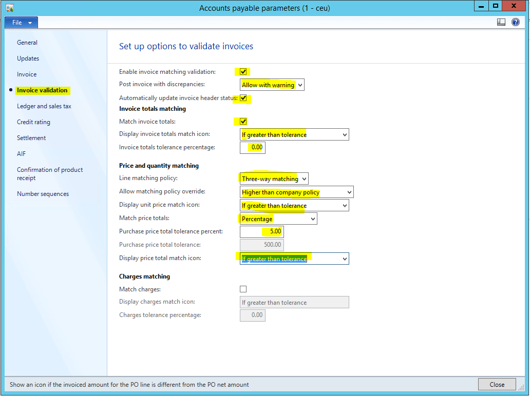- In the Accounts payable parameters form, click the Invoice validation tab.