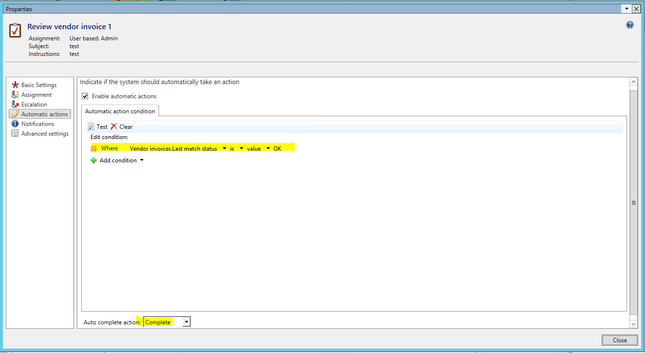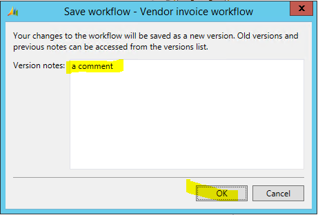 - Back in the Vendor invoice workflow form, click the Save and close button.