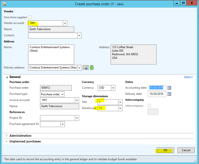 - Click OK out of the Create purchase order form.