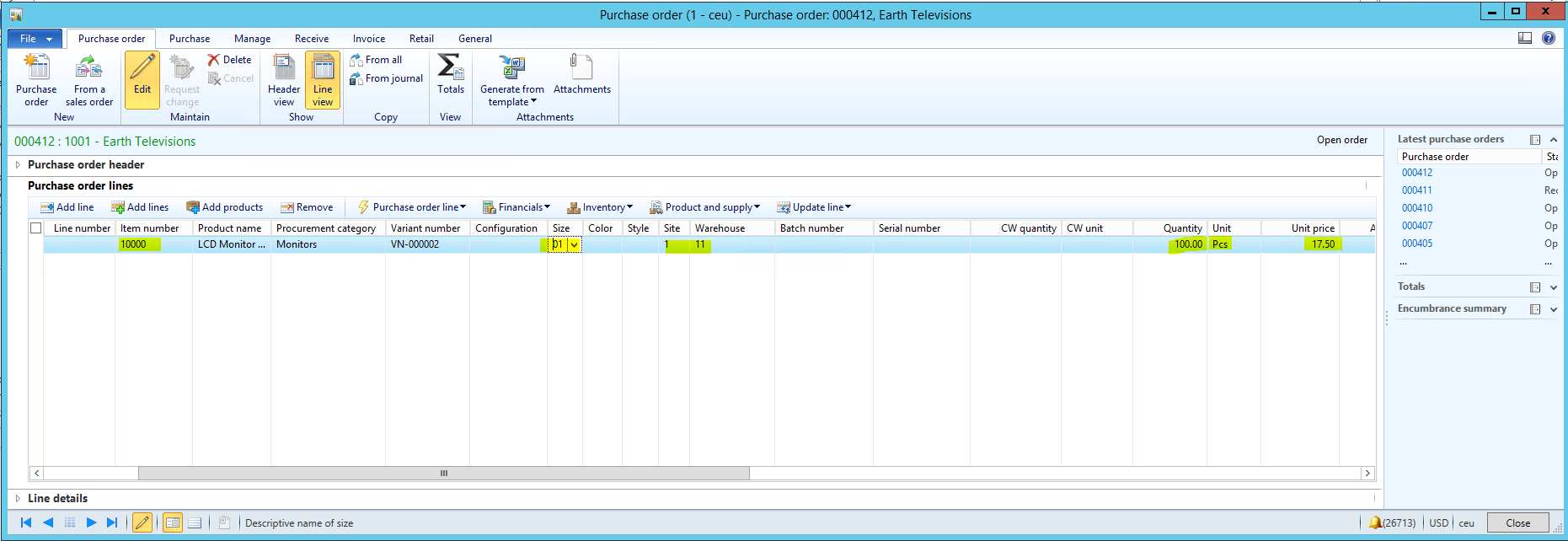 - In the Purchase order form, enter the following line: