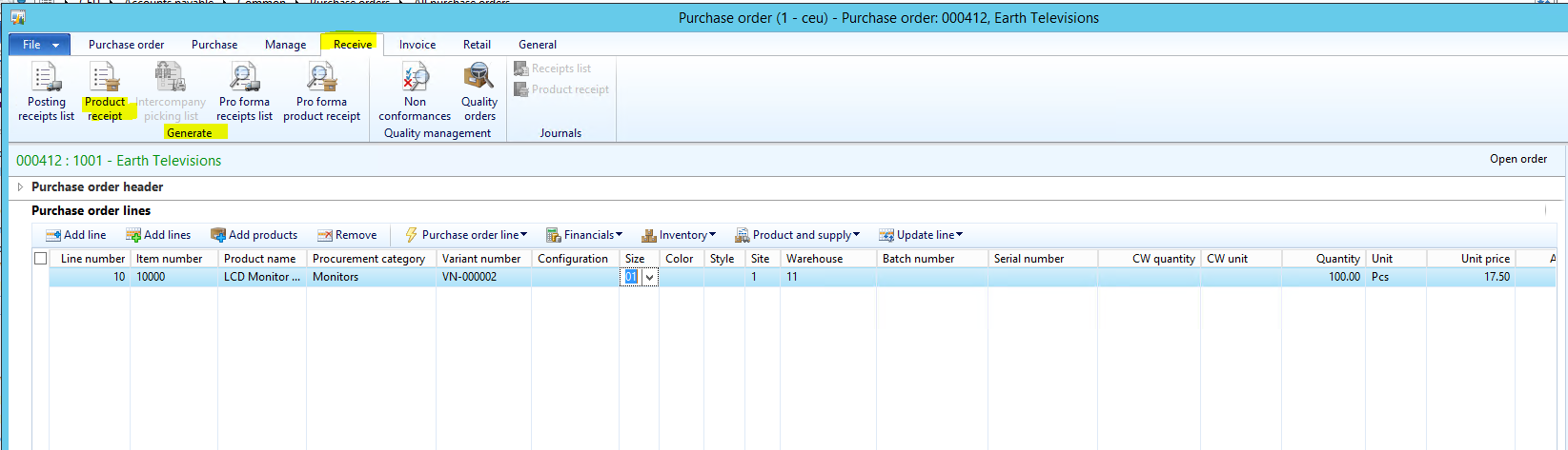 - In the Purchase order form, click the Receive tab at the top, and then click Generate | Product receipt.