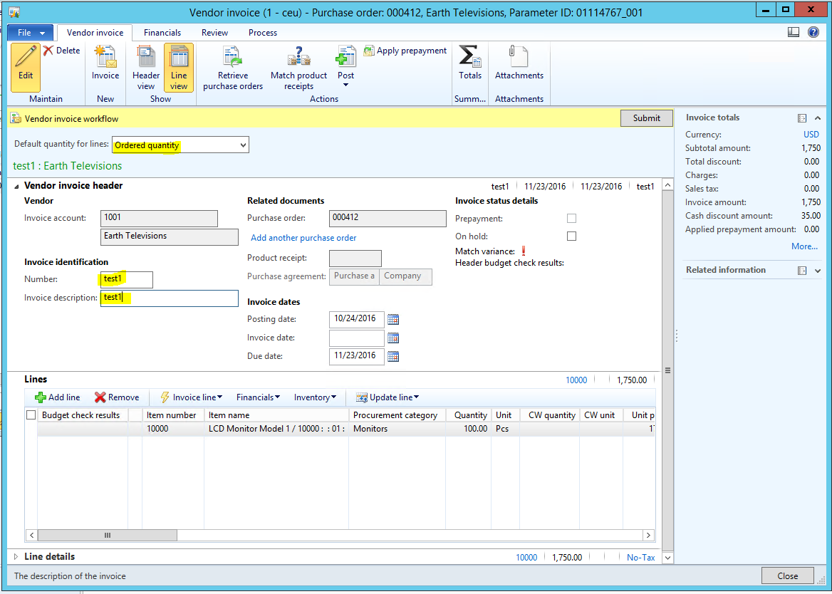 - In the Number and Invoice description fields, enter ‘test1’.
