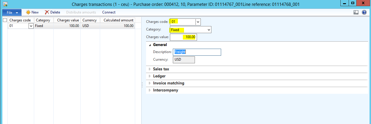 - Click on the Vendor invoice line, and then click Financials | Maintain charges.