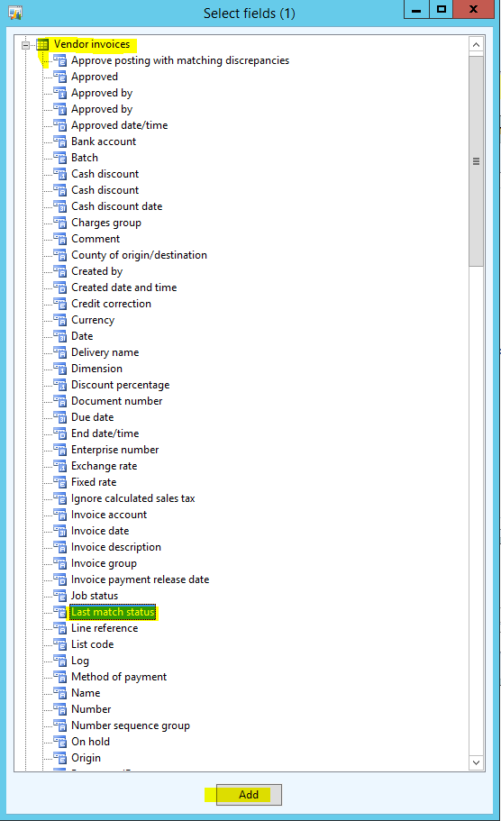 - In the Select fields, select the Vendor invoices.Last match status field, and then click the Add button.