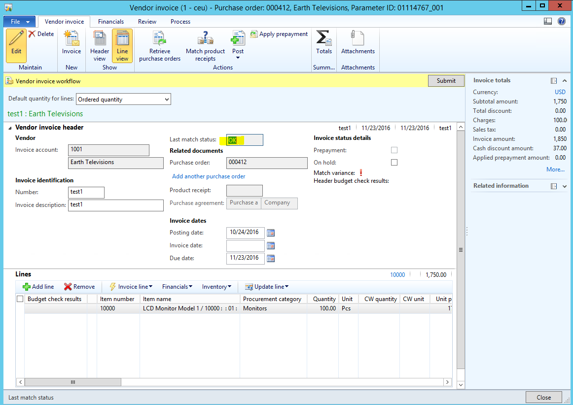 - In the Vendor invoice form, notice that the Last match status field says ‘OK’.