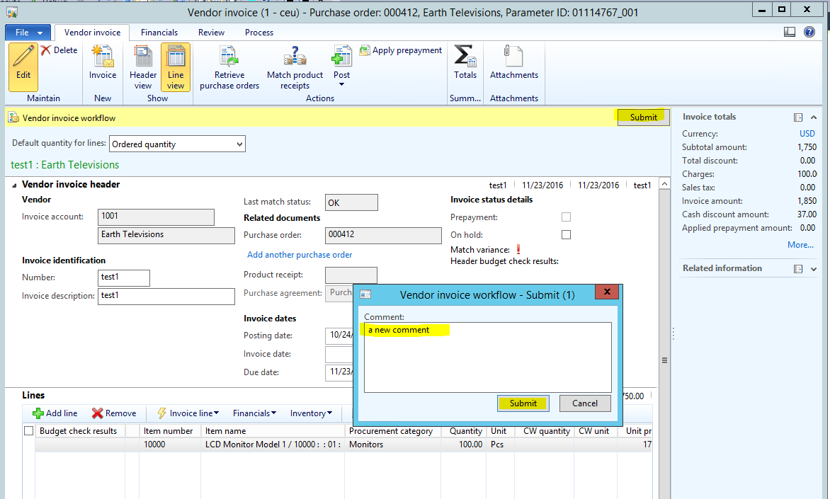 - In the Vendor invoice form, click the Submit button, enter a Comment, and then click Submit.