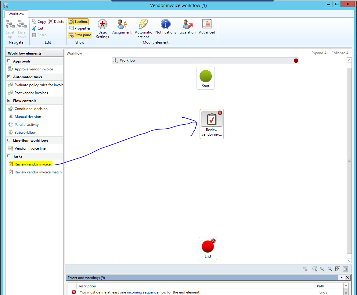 - In the Vendor invoice workflow form, drag the Review vendor invoice task onto the Canvas.