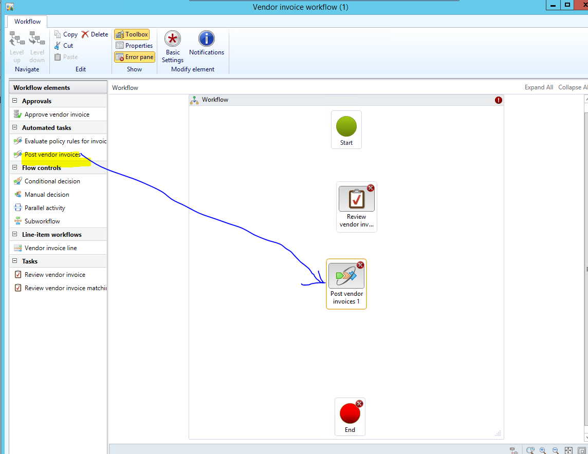 - In the Vendor invoice workflow form, drag the Post vendor invoices Automated tasks to the Canvas area underneath the Review vendor invoices task.