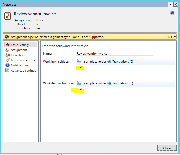 - In the Review vendor invoice 1 form, enter ‘test’ in the Work item subject and Work item instructions areas.