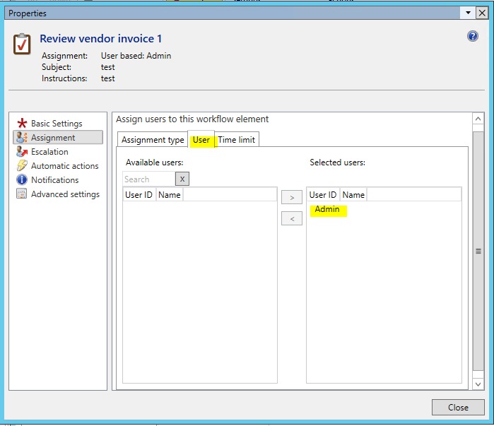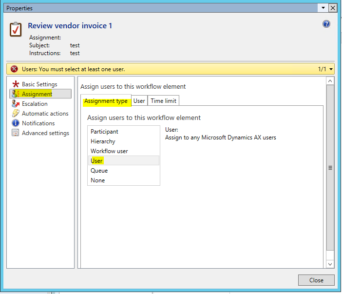 - In the Review vendor invoice 1 form, click the Assignment tab, and select ‘User’ on the Assignment type tab.