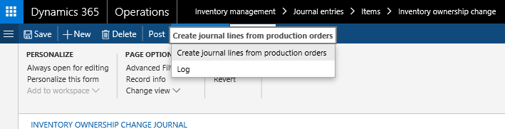 - Process an ownership change journal that is linked to a production, to record the change of ownership of the inventory from the vendor to the current legal entity.