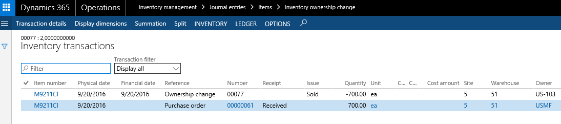 As it can be seen from the above screenshot, the inventory ownership change process automatically updated the Issue field with Reserved physically and Picked and the Owner dimension value is updated to USMF.