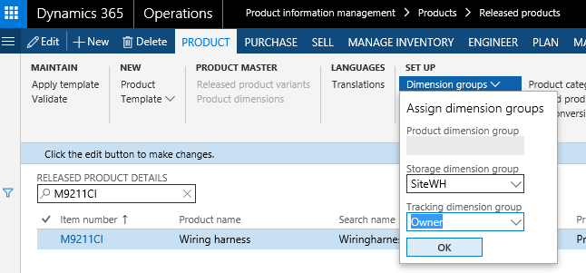 Click Product information management > Setup > Dimension and variant groups > Tracking dimension groups.