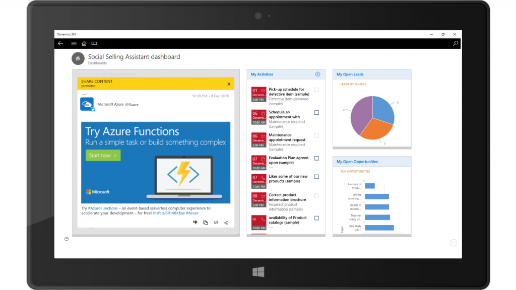 Microsoft Social Engagement empowers sales teams to sell more by leveraging social media through personalized, actionable smart recommendations from the newly released Social Selling Assistant. Social Selling Assistant, available through Microsoft AppSource, leverages the power of Azure Machine Learning to recommend content to share and keep you informed about your company, competitors, or customers on social. Best of all, Social Selling Assistant's built-in intelligence and integration with the Dynamics 365 for Sales application means it takes only a few minutes each day for your sellers to build a credible social presence and learn what's top-of-mind for customers.