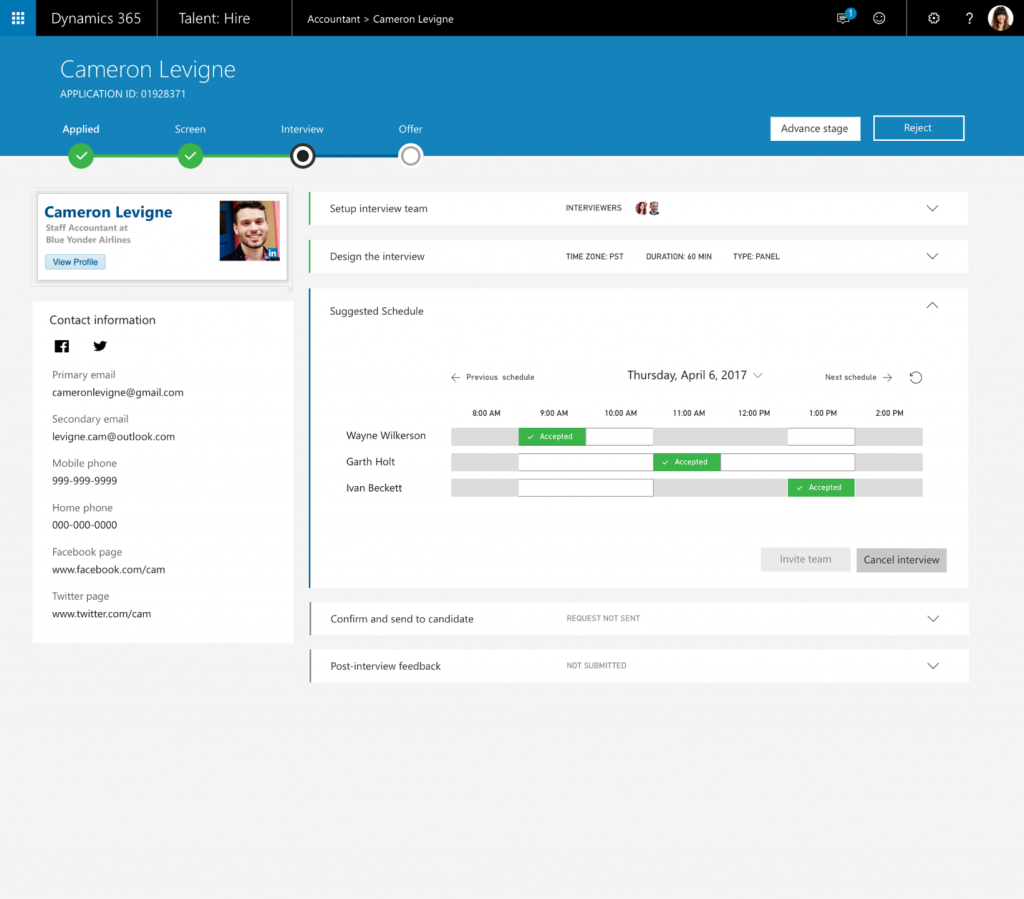 Eliminated the back-and-forth of emails when trying to coordinate interview times between candidates and interviewers. Dynamics 365 for Talent automatically integrates with Office 365 to find the best times for everyone.