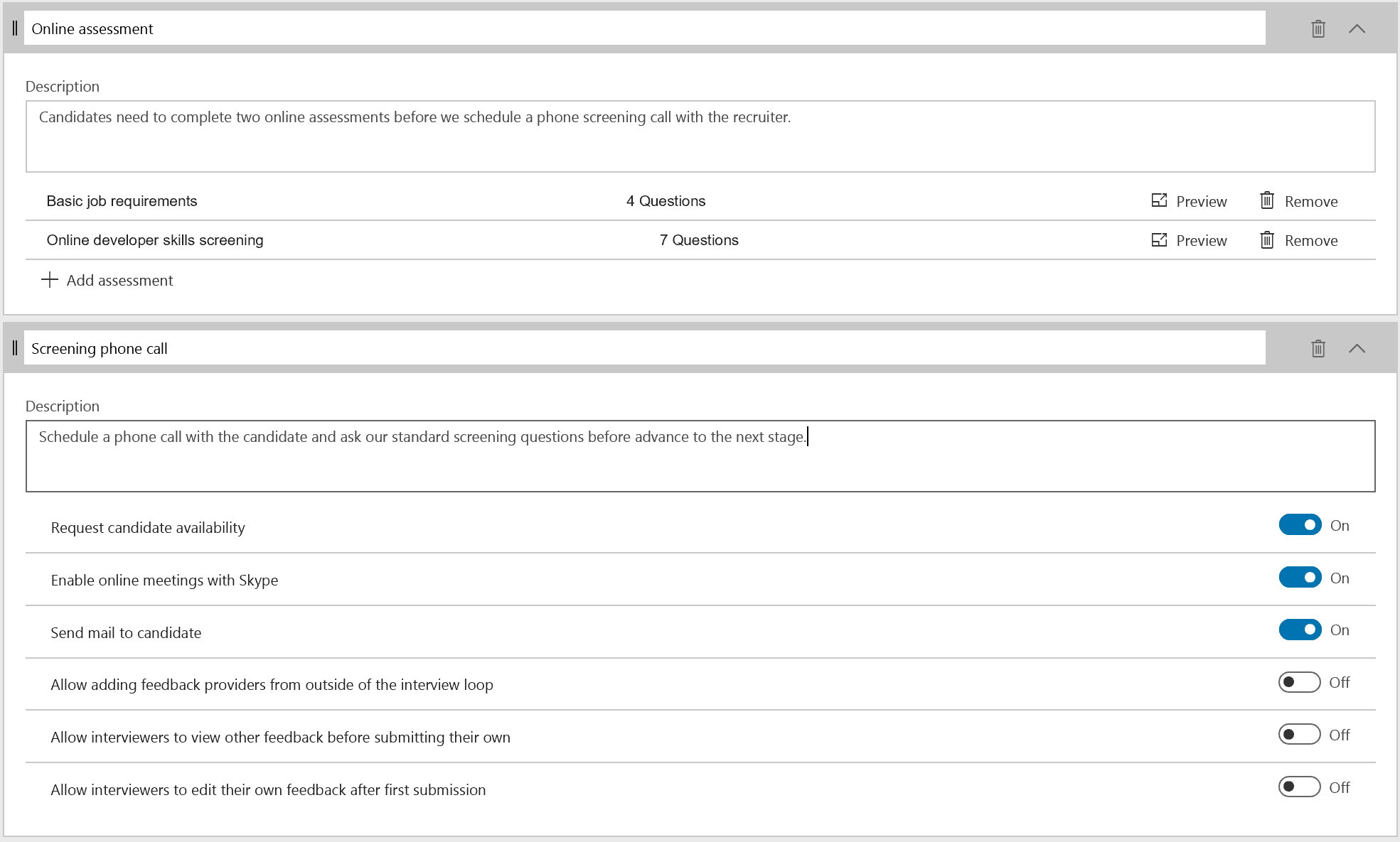 Collect information during the hiring process using Activities. As part of each step of the hiring process, you can define various activities, and their behavior, that need to be performed in order to collect information about your candidates. For example, you may want to require the candidate to complete an online assessment as well as a phone interview as part of a screening stage, or ensure that a background check is performed as part of the offer stage. Whatever is needed, you select the activities and configure the behavior in each stage to ensure you make an educated decision to reject or advance a candidate through your process. Out-of-the-box, Attract provides a growing list of activity types you can pick from and setup to fit your needs.