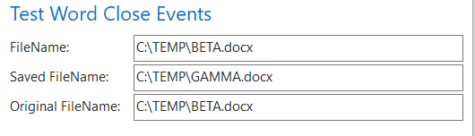 - Back to the remaining document, BETA.DOCX, do some modifications to the document (this is not mandatory) and then save the document with a different name (save as) like. E.g. C:\TEMP\GAMMA.docx and close it. The Test Word Close Events page will trigger the close event and report the following
