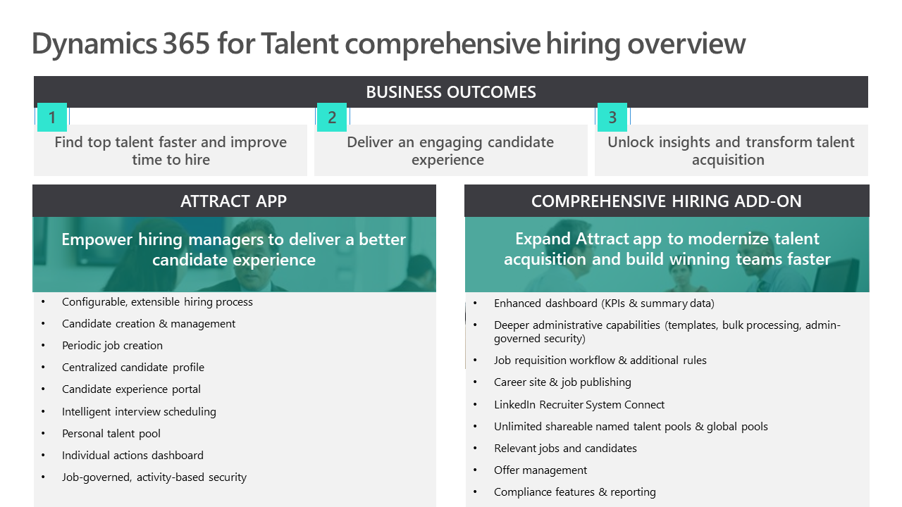 Dynamics 365 for Talent takes a modern approach to talent acquisition. We have digitally transformed the hiring experience to connect everyone on the hiring team – so you improve your quality of hire, while shortening the time to get them onboarded and impactful. Talent empowers recruiters to collaborate more effectively with hiring managers and offers the tools needed to treat candidates like VIPs.