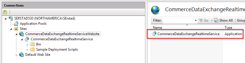 Solution: This is almost always caused by a mismatch between the “Web application name” setting on the Real-time Service profile and the actual application itself. In my example I intentionally misspelled it; usually when this error pops up I see people using the Web site itself (CommerceDataExchangeRealtimeServiceWebsite) instead of the application (CommerceDataExchangeRealtimeService). Double check those two and make sure they’re exactly the same.