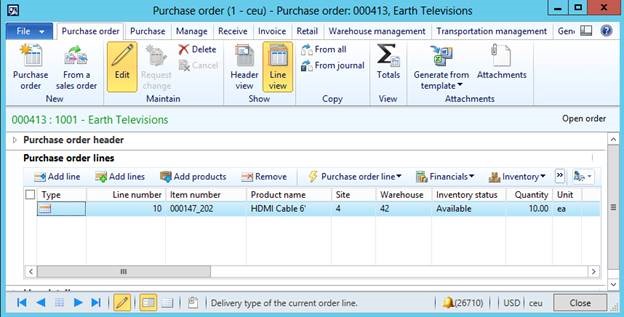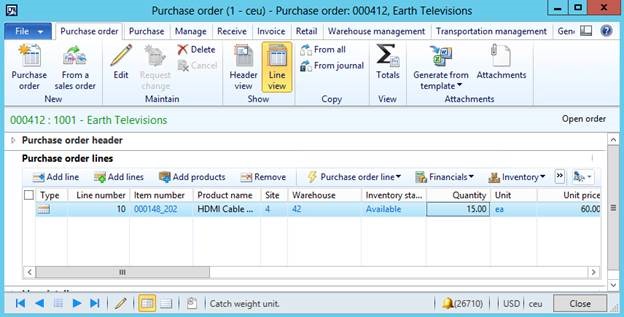 To get started, we need two purchase orders. Each purchase order will contain a line for two different WHS-enabled items. The following illustrations show the purchase orders that I have created.