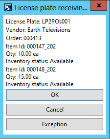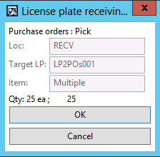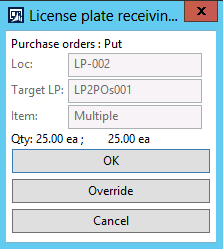 You will note that, from a receiving standpoint, the process is the same for purchase orders. All you have to do is scan the license plate and perform the put away work.