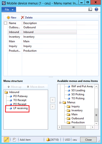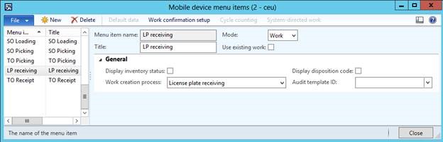 To receive orders, you will need to create a mobile device menu item where Mode is set to Work, and Work creation process is set to License plate receiving, as shown in the below screenshot.