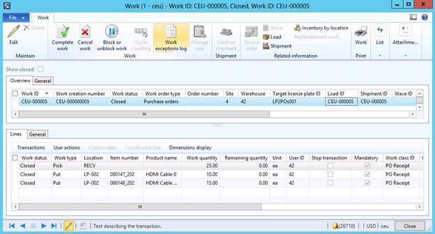 If you look closely at the work lines you will notice that we actually had two separate put lines, one for each of the items, but we only saw one step on the mobile device. This is how WMDP optimizes the process when items are going to the same location, which in our case they were.