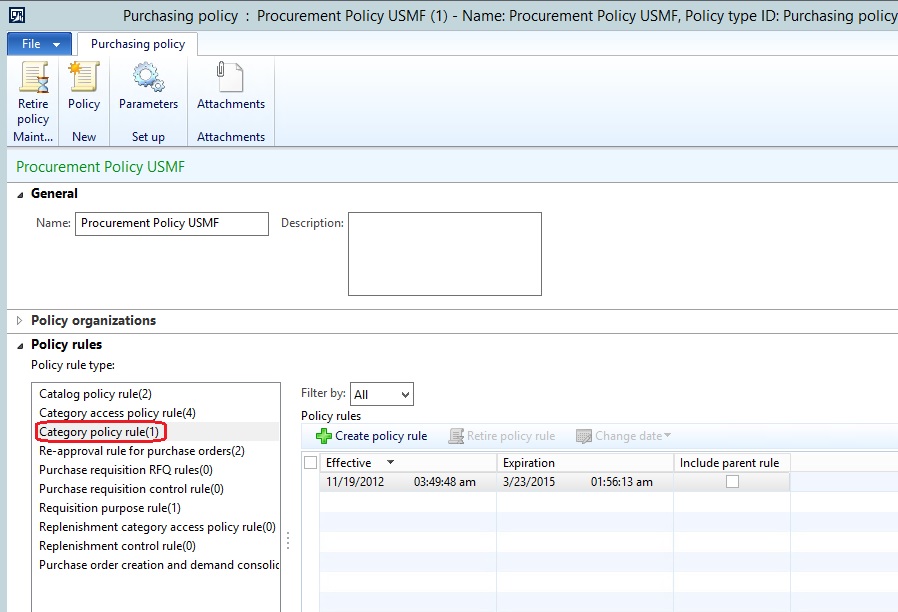 Go to Procurement and sourcing| Setup| Policy| Purchasing policy (select or create policy)