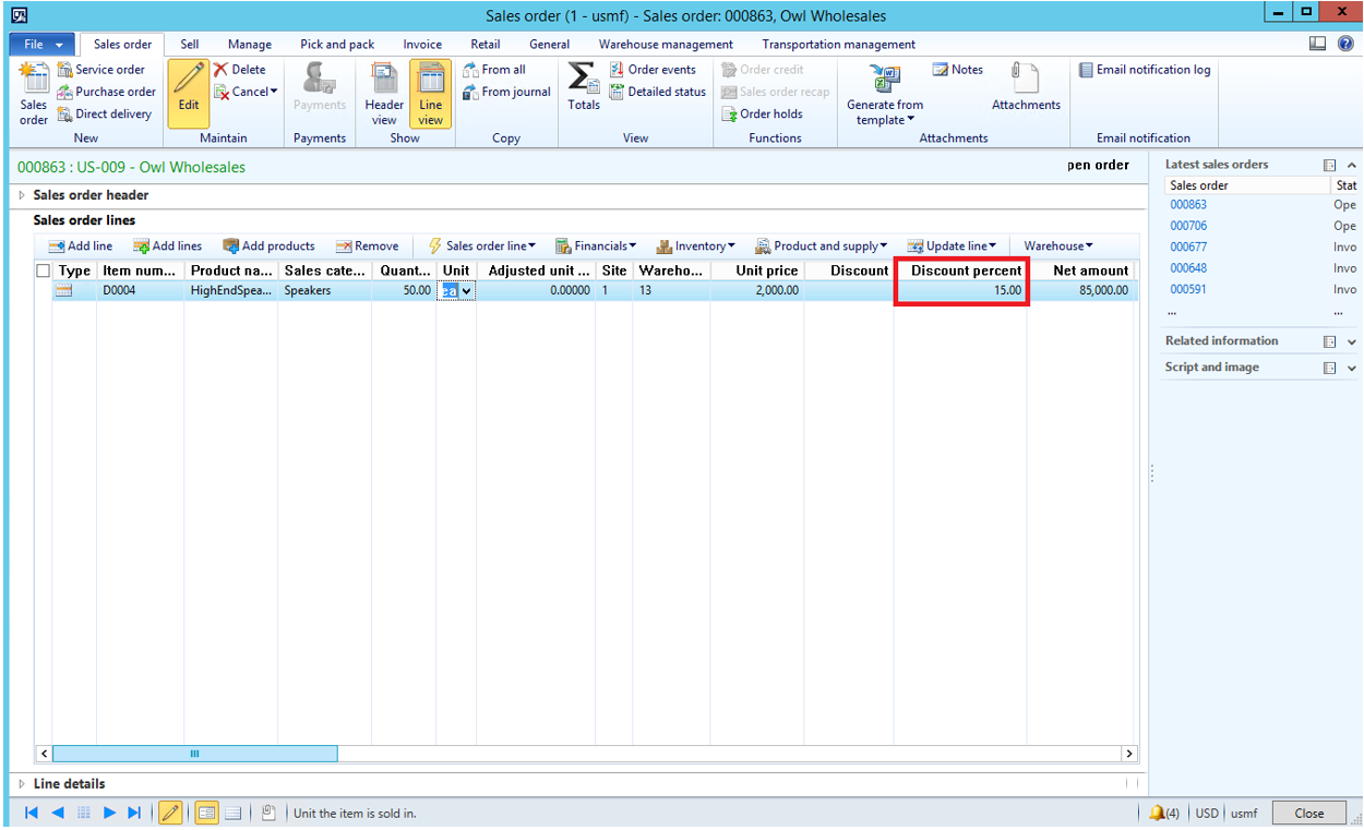 Change the quantity to 50. And here you can see that my discount percent of 15 percent has populated into the discount percent form.