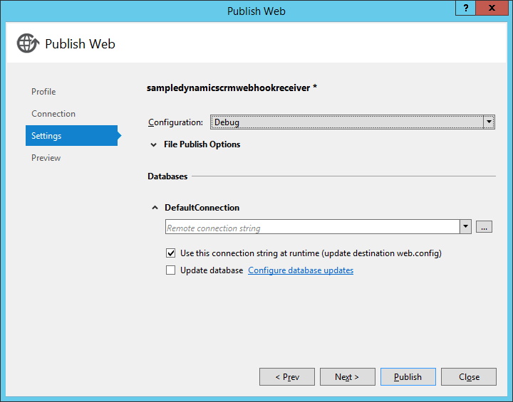 Add the CRM WebHook receiver to your web application project, as shown above, and rebuild it. Then publish it to your website from Visual Studio by selecting the web application project in Solution Explorer and choosing Build > Publish […].