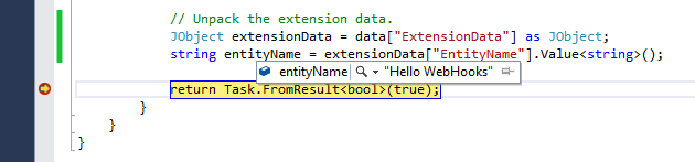 Now go back into the CRM application and activate your workflow. Next, create and save a new account in CRM. After a few seconds, the breakpoint in the WebHookHandler subclass in your web application should be hit, showing the data from the new account. This means that the event was successfully sent to the web application.